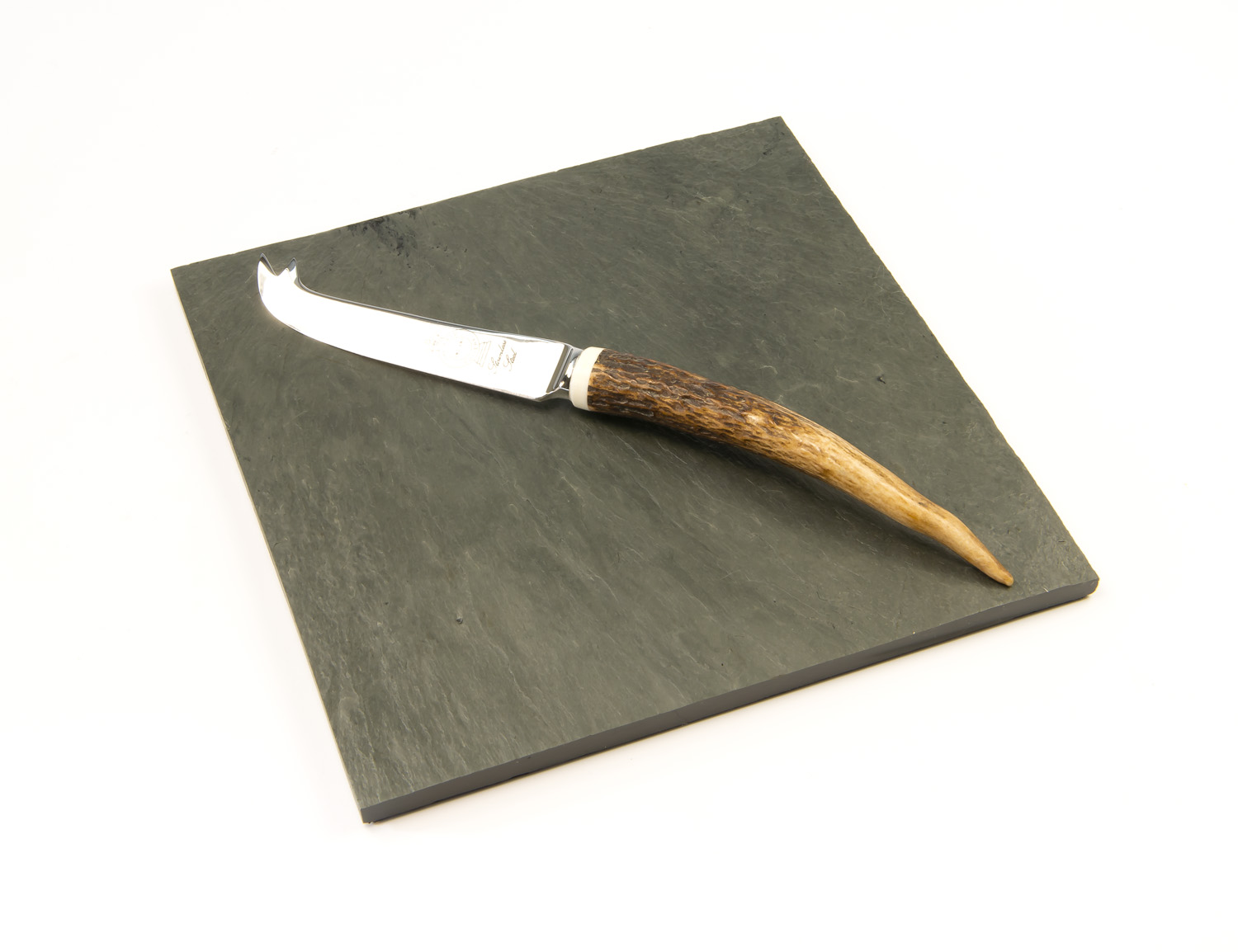 One of the creations in my “Red Stag” gift series is a riven Devonshire slate 8 inches square (approx) backed with neoprene foam so there will be no scratching or slipping on your table and complemented with a hand made cheese knife with a highly polished Sheffield stainless steel blade and a genuine Red Deer Stag antler handle.