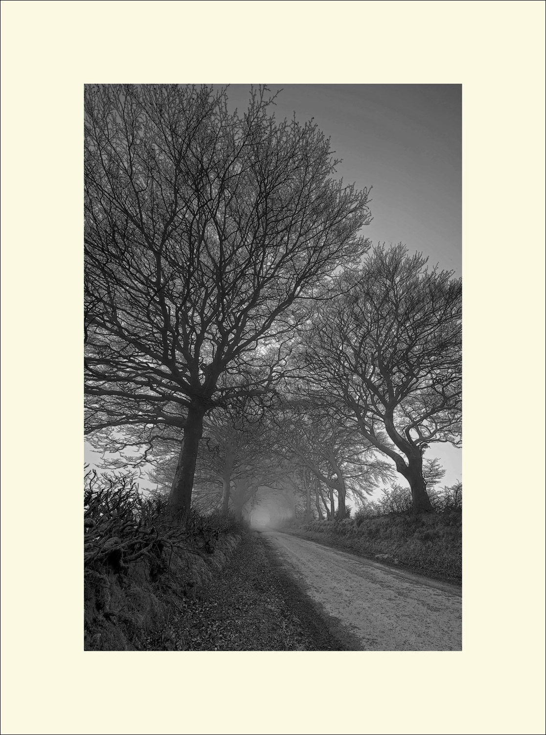 This moody black and white picture is of an avenue of beech trees on Exmoor.