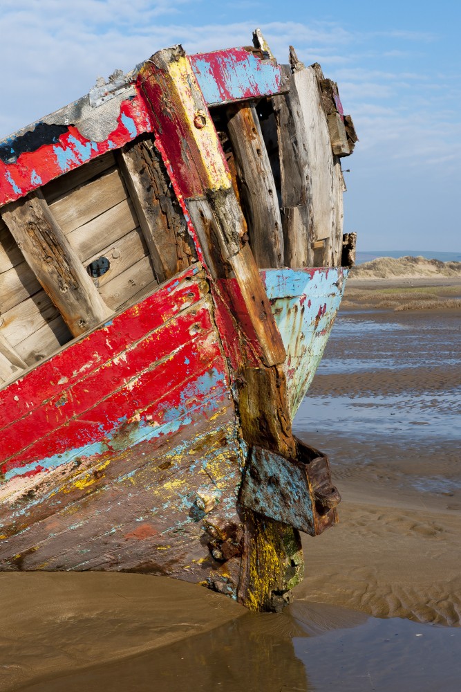 Gaily painted this defiant old sand barge lies rotting here on Crow Point, her working days over she silently waits for each tide to wash her boards and deposit more sand inside her hull.